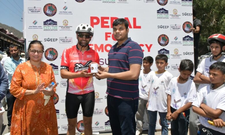 सोलन में आज सुव्यवस्थित मतदाता शिक्षा एवं निर्वाचक सहभागिता कार्यक्रम (स्वीप) के तहत ‘बाईसिकल इवेंट फॉर वोटर अवेयरनेस’ जागरूकता रैली का आयोजन किया गया। जागरूकता रैली को ज़िला निर्वाचन अधिकारी एवं उपायुक्त सोलन मनमोहन शर्मा ने हरी झण्डी दिखाकर रवाना किया।