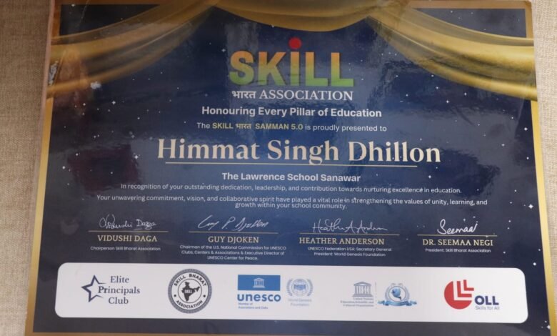 The Lawrence School, Sanawar के हेडमास्टर श्री हिम्मत सिंह ढिल्लों को कौशल-आधारित एवं भविष्य उन्मुख शिक्षा के क्षेत्र में उनके उत्कृष्ट नेतृत्व और दूरदर्शी योगदान के लिए प्रतिष्ठित ‘स्किल भारत सम्मान 5.0’ पुरस्कार से सम्मानित किया गया है।