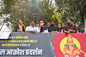 श्री अनुराग सिंह ठाकुर ने कहा “कांग्रेस हाईकमान का उन लोगों से सीधा संबंध है जिन्होंने भगवान अय्यप्पा का सोना चुराया है, सोनिया जी और उनके परिवार को करोड़ों अय्यप्पा भक्तों के सामने जवाब देना चाहिए। दो फ्रंट पर कांग्रेस ने हिंदुओं की आस्था, विशेषकर अय्यप्पा श्रद्धालुओं की आस्था के साथ खिलवाड़ किया। पहला, जब सबरीमाला केस में महिलाओं के प्रवेश को लेकर अदालत का निर्णय आया तो भाजपा ने उनके परंपराओं, रीति-रिवाज़ को बचाने के लिए प्रदर्शन किया। जब कोर्ट का निर्णय आया कि महिलाओं का प्रवेश सबरीमाला मंदिर में हो जो मंदिर की परंपराओं के खिलाफ थे। भाजपा ने उसका विरोध किया लेकिन कांग्रेस ने इसका जश्न मनाया…सिर्फ भाजपा ने अय्यप्पा श्रद्धालुओं की लड़ाई लड़ी, दूसरा सबरीमाला सोना घोटाले में जो अभियुक्त हैं उन्नीकृष्णन पोट्टी, वे बार-बार सोनिया गांधी से मिलते हैं… जो मंदिरों से सोना चुराते हैं उनसे सोनिया गांधी मिलती हैं… हम इसमें CBI जांच की मांग कर रहे हैं। मेरा कांग्रेस से दो सवाल है कि जब कोर्ट का निर्णय आया तो कांग्रेस ने अय्यप्पा श्रद्धालुओं की अस्था के खिलाफ जश्न क्यों मनाया और सबरीमाला सोना घोटाले के अभियुक्त उन्नीकृष्णन पोट्टी बार-बार सिंडीकेट से क्यों मिले?