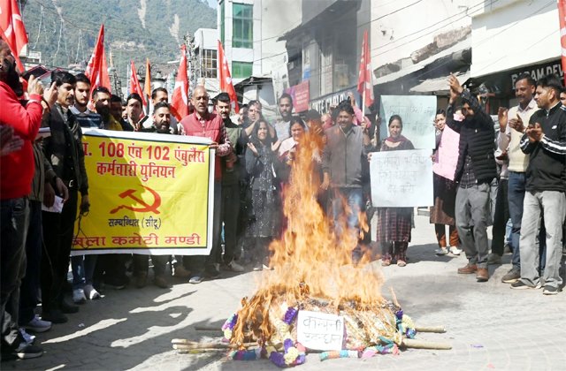 Mandi में एम्बुलैंस कर्मचारियों का उग्र प्रदर्शन: चौहाटा बाजार में ‘शव यात्रा’ निकाल सरकार का पुतला फूंका